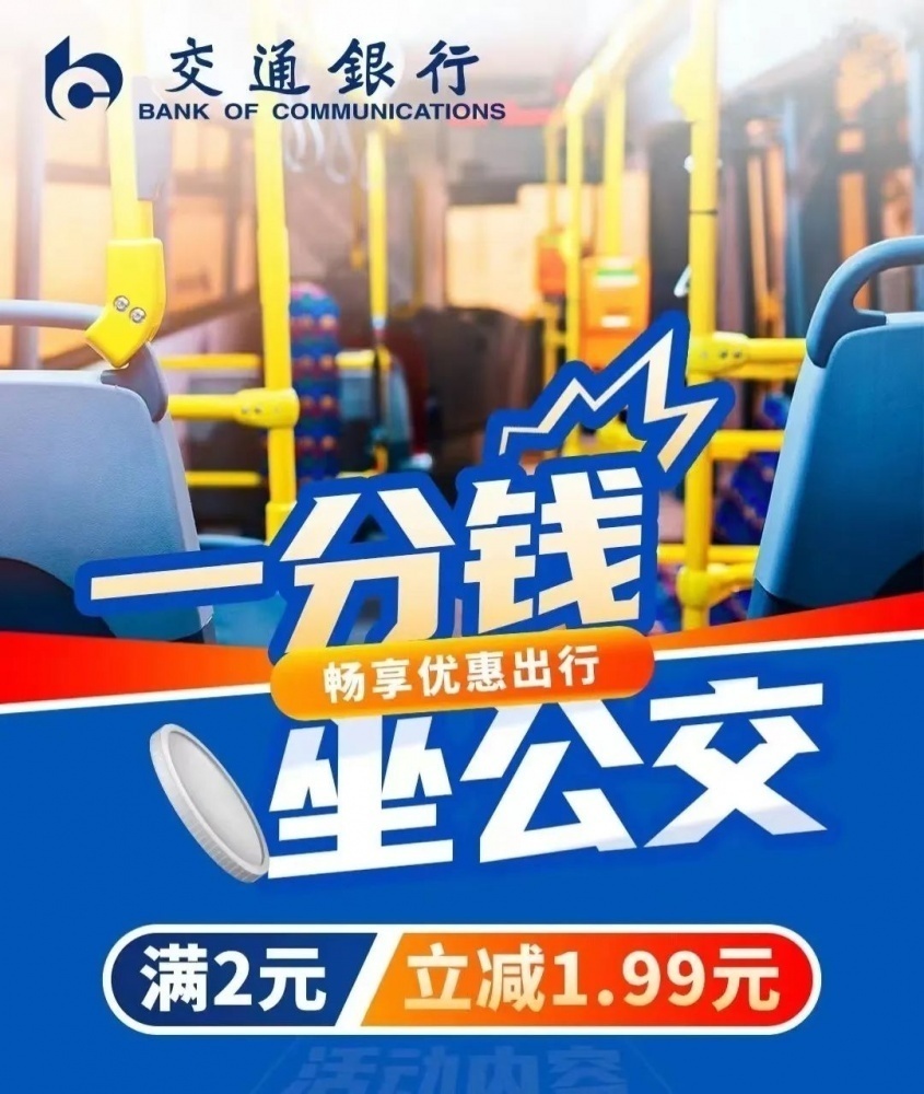 使用交通銀行手機APP出示付款碼乘車可享滿2元立減1.99元優(yōu)惠?;顒涌偯~10000個,單用戶每日可享受1次優(yōu)惠,每月可享受10次優(yōu)惠,名額有限,先到先得。