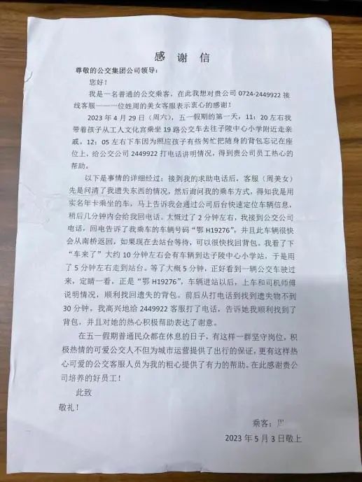 5月4日,小雨,一位熱心乘客走進(jìn)了荊門市公共交通集團(tuán)有限公司客服中心,送來一封溫暖的感謝信。信中,她向“五一”節(jié)假日期間堅(jiān)守崗位、積極熱心的公交人表達(dá)了濃濃謝意,紙短情長,字里行間流露出款款真情。